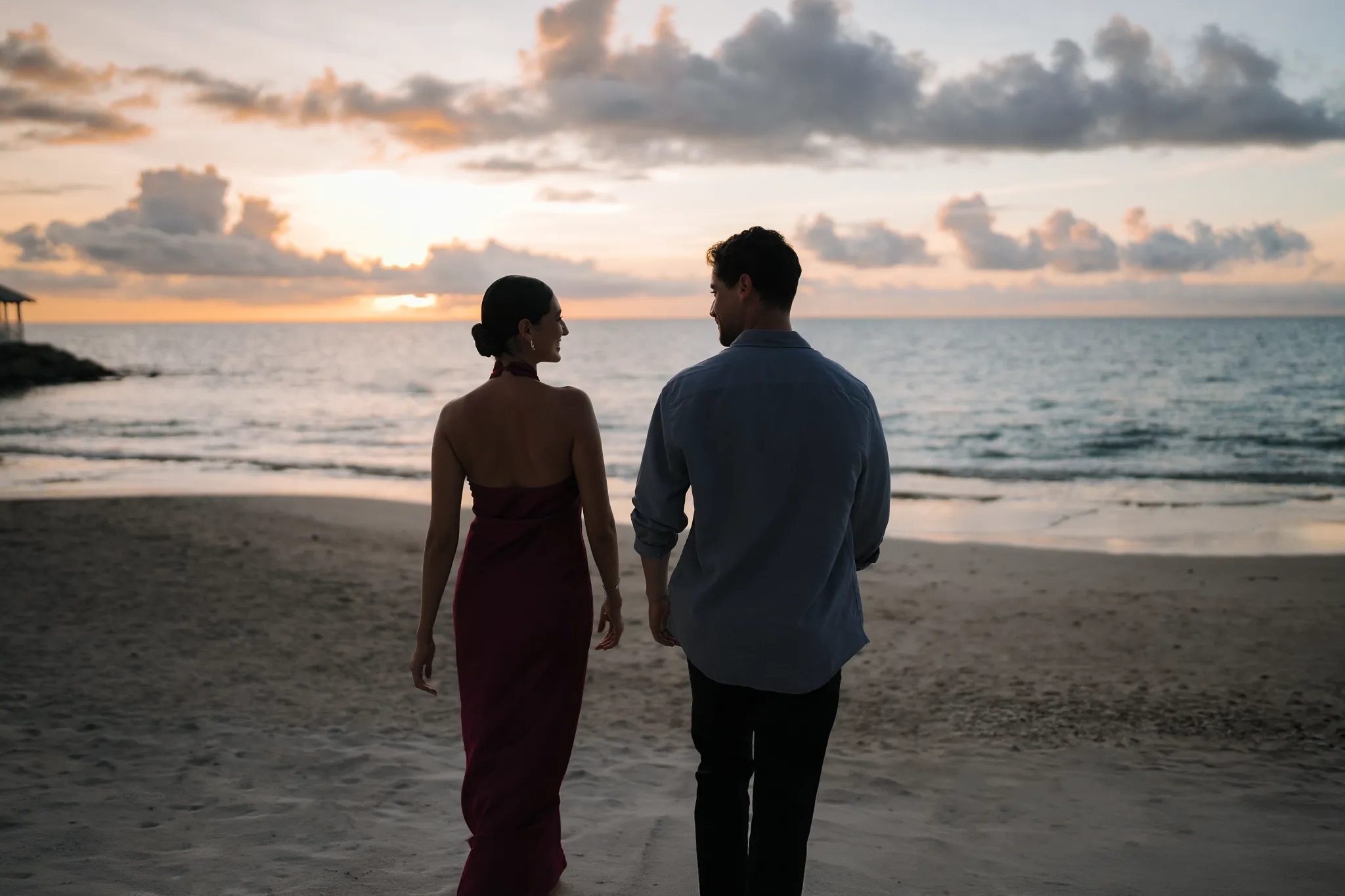Couple's romantic walk by the beach