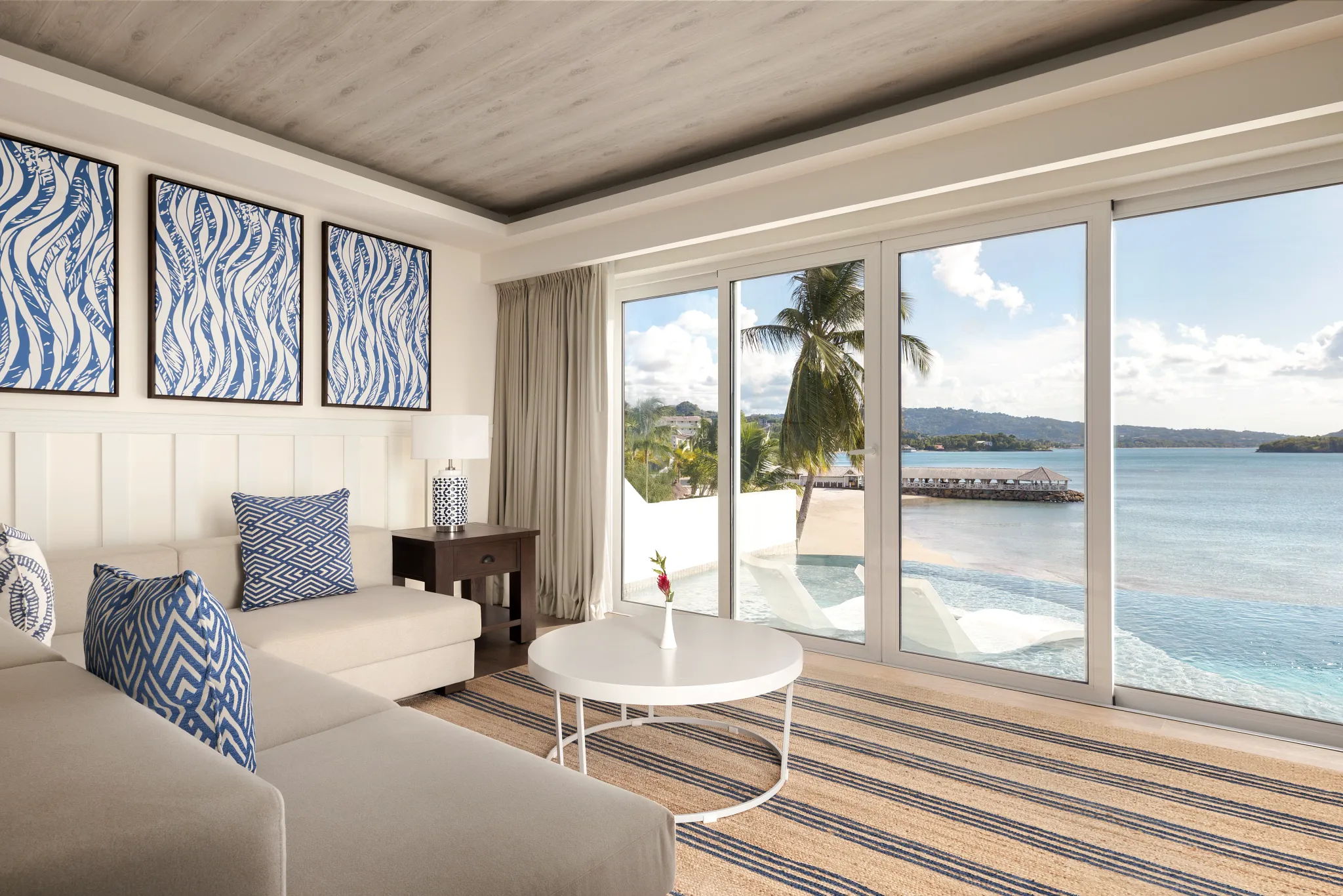 Spacious bungalow living area with direct access to the infinity pool