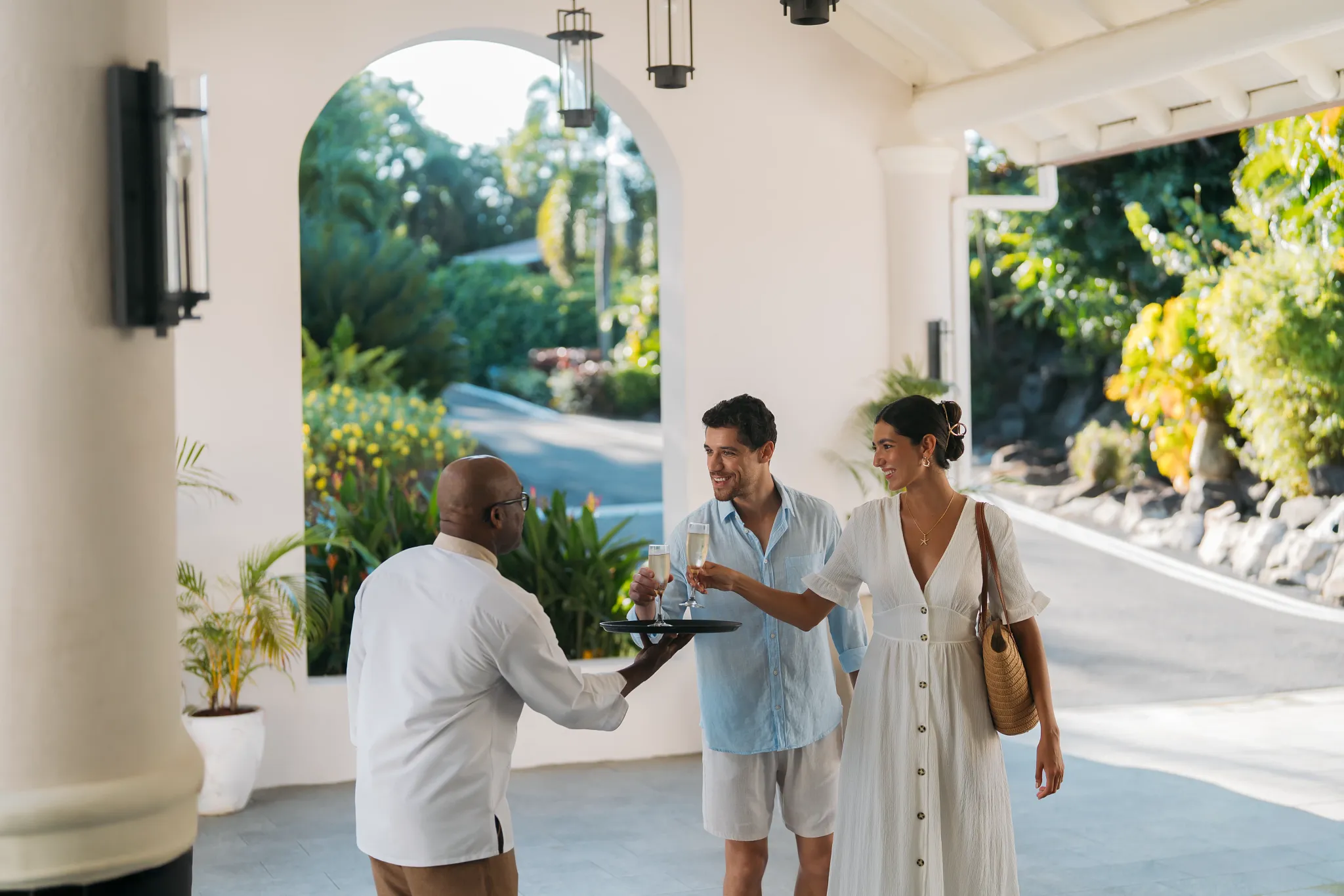 Couple arriving at the hotel and being welcomed by the staff
