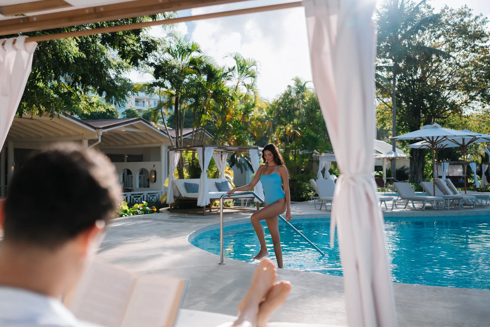 Couple relaxing at small pool